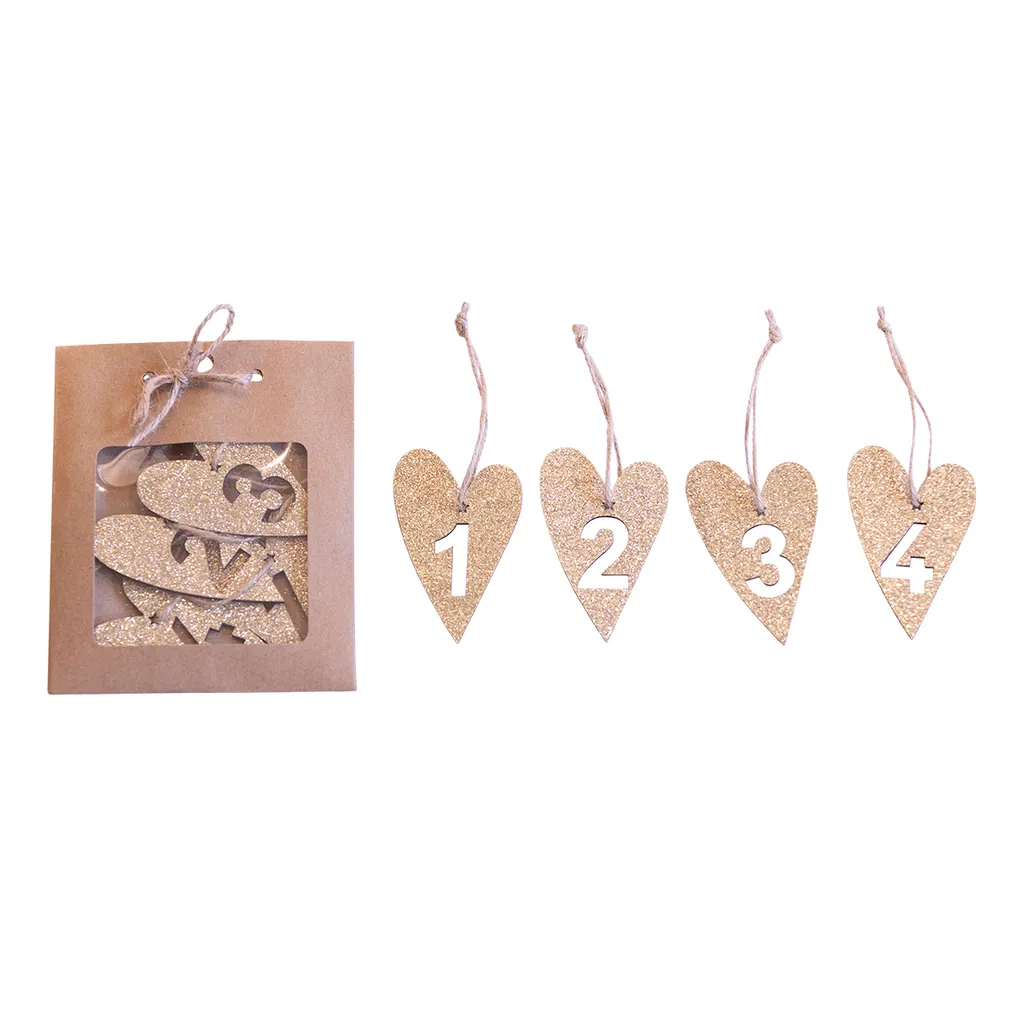 Flotte og dekorative adventstal i træ med guld glimmer.