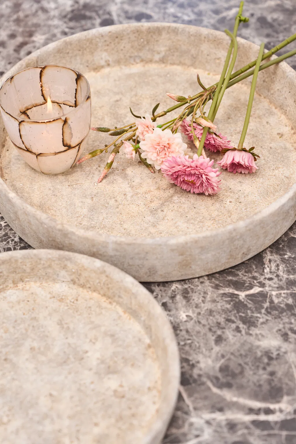 Fad i cement i støbt cement med et flot farvespil og patineret udtryk, som giver det et look som et gammelt marmorfad.