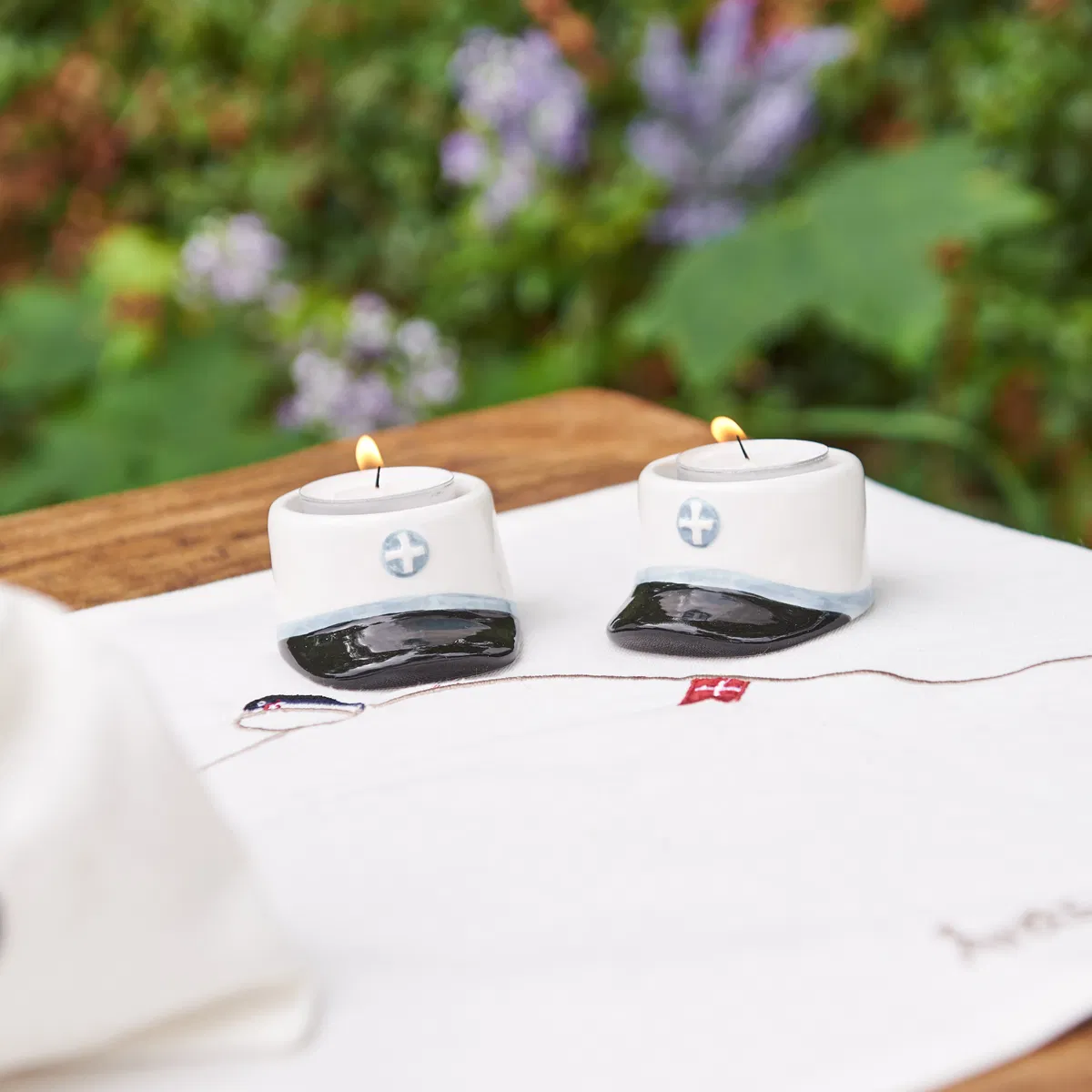 Fyrfadsstage designet som studenterhue – blå eller rød student.